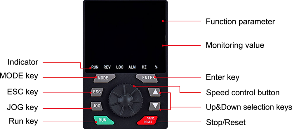 | Yavaş hareket kontrolü | Motor hemen çalıştırılıp durdurulabilir; Jog frekansı ayar aralığı: 0,0-20,0Hz; Jog stop modu: yavaşlama/serbest/DC frenleme |