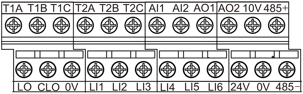| Röle Çıkışı | T1A,T1B,T1C T2A、T2B、T2C | T1A normalde açık, T1B normalde kapalı, T1C ortak noktası T2A normalde açık, T2B normalde kapalı, T2C ortak noktası Kontak kapasitesi: 5A@250VAC, 5A@30VDC Arıza, alarm, frekansa ulaşma ve diğer fonksiyonlar isteğe bağlıdır T1A varsayılan olarak arızaya, T2A varsayılan olarak çalışmaya geçer |