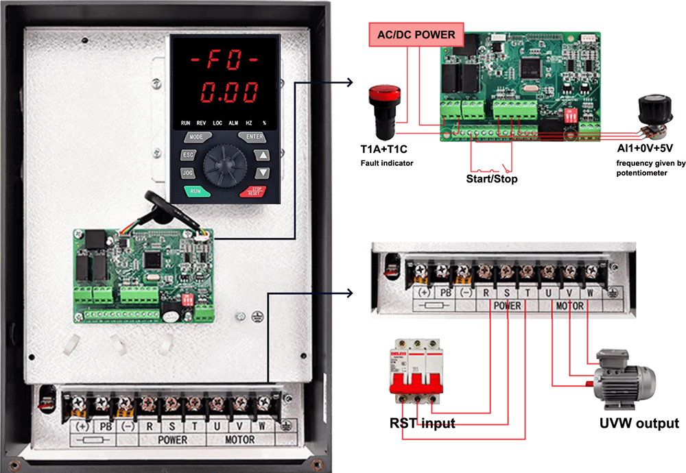 | Röle Çıkışı | T1A,T1B,T1C T2A、T2B、T2C | T1A normalde açık, T1B normalde kapalı, T1C ortak noktası T2A normalde açık, T2B normalde kapalı, T2C ortak noktası Kontak kapasitesi: 5A@250VAC, 5A@30VDC Arıza, alarm, frekansa ulaşma ve diğer fonksiyonlar isteğe bağlıdır T1A varsayılan olarak arızaya, T2A varsayılan olarak çalışmaya geçer 220V 0.4kW-2.2kW ve 380V 0.4kW-1.5kW ürünlerde sadece 1 röle çıkışı vardır yani TA TB TC |