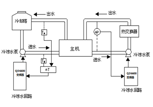 | 04 sistem tanıtımı: Bu sistemde, iki adet 110KW soğutulmuş su pompası, iki adet D71 110KW invertör tarafından çalıştırılır ve ayrıca fanları (iç mekan fanları ve soğutma kulesi fanları dahil) çalıştıran birkaç D71 invertör vardır. Soğutulmuş su sirkülasyon sisteminde, invertörün analog geri besleme sinyalini elde etmek için su giriş devresinin sinyali 1 (sıcaklık sinyali veya basınç sinyali) ve su çıkış devresinin sinyali 2 (sıcaklık sinyali veya basınç sinyali) analog modüle gönderilir. İnverterin dahili PID fonksiyonu sayesinde kapalı çevrim otomatik kontrol gerçekleştirilir. | | ||||||||||||||||||